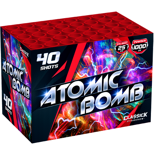 Pyroshow Atomic Bomb 40 Shots €79,99 €39,00 Geen pauze, geen genade. ATOMIC BOMB is next level. 40 shots en maar liefst 1000 gram kruit. Voor de echte maniacs! Merk: Rubro Classick Artikelnr: 5012